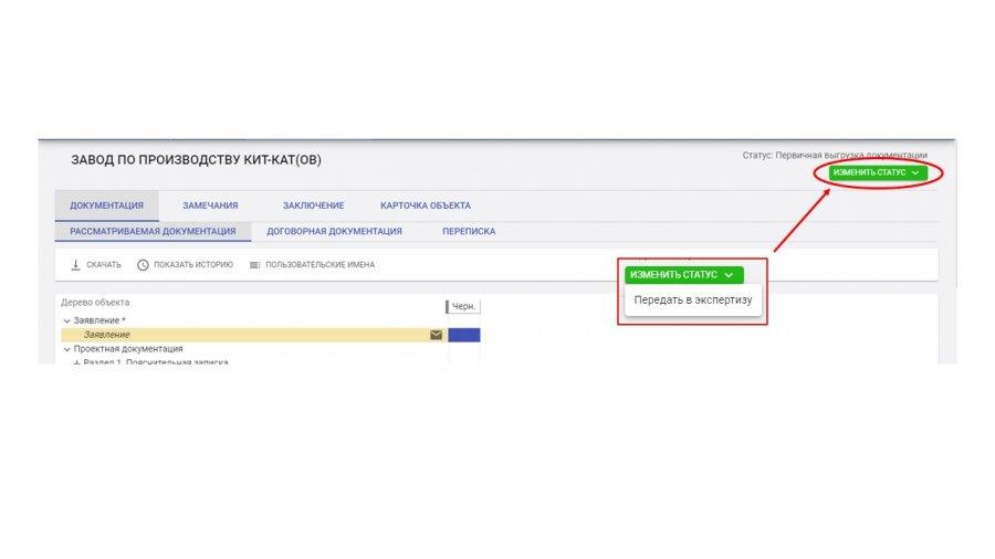 После загрузки документации в правом верхнем углу необходимо нажать "Изменить статус" -> "Передать в экспертизу".
